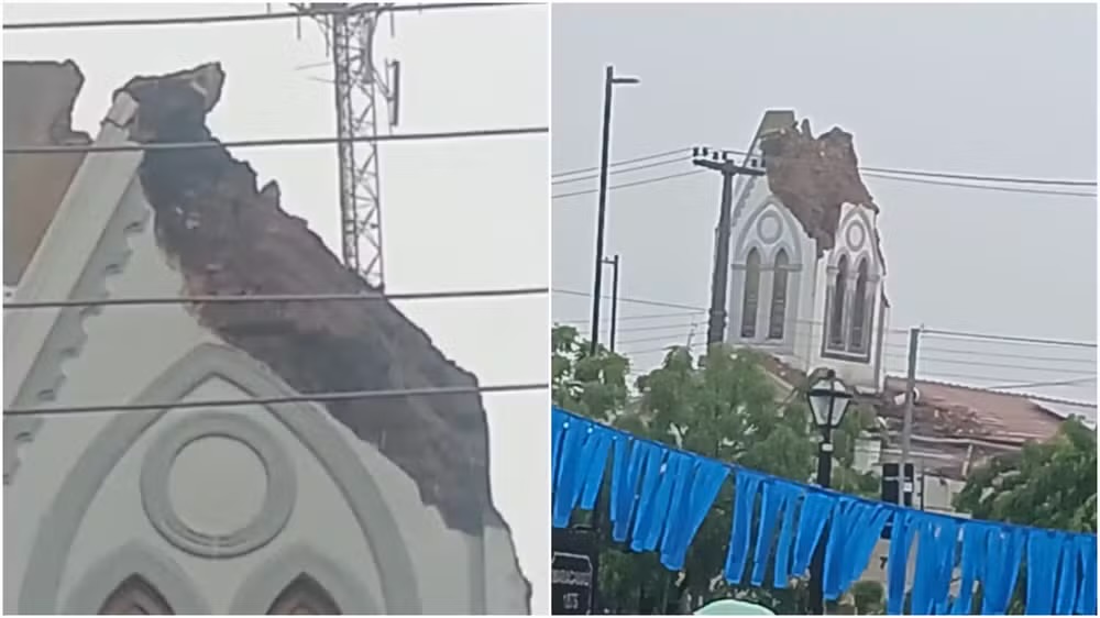 Parte do teto da Paróquia São José, localizada no Centro de Maracanaú, na Região Metropolitana de Fortaleza, desabou na manhã desta quarta-feira (19), deixando duas pessoas feridas.